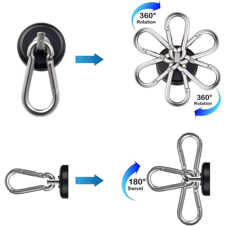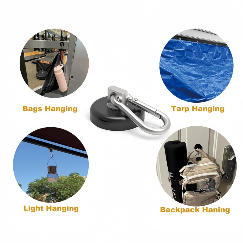 Integrated carabiners allow for quick and easy installation and removal of tools, ropes, cables, and accessories. Their secure locking design enhances safety and efficiency, making these waterproof black magnetic hooks ideal for industrial and outdoor applications.