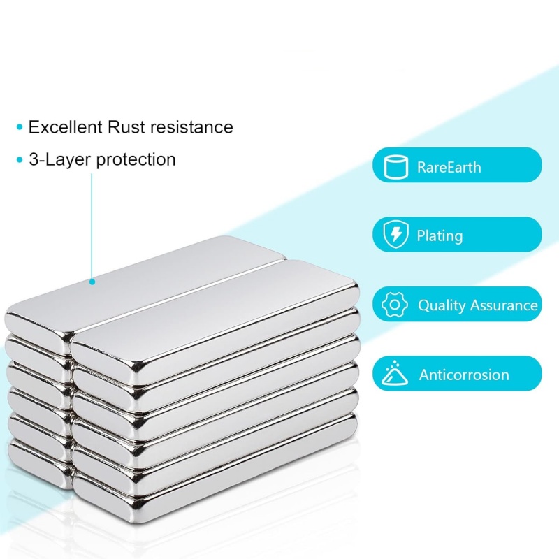 Each bar neodymium magnet features a high-quality Ni+Cu+Ni three-layer coating that provides excellent corrosion resistance and long-lasting magnetic performance. The strong magnetic force remains stable over time, even in different environmental conditions.