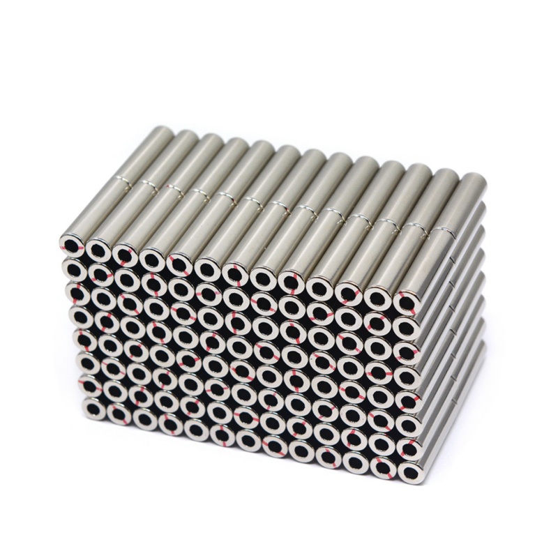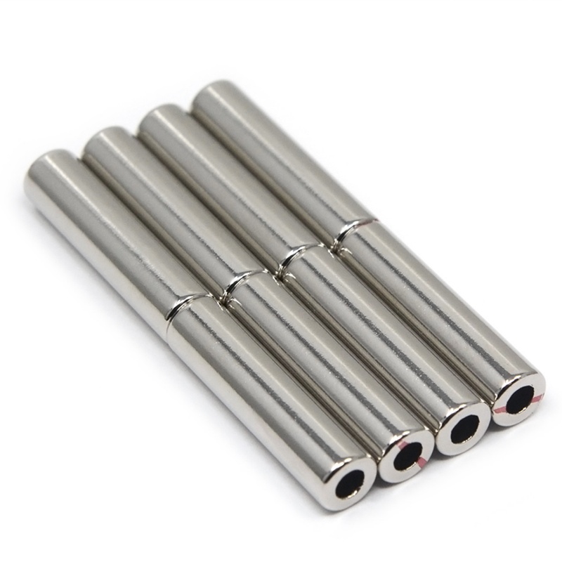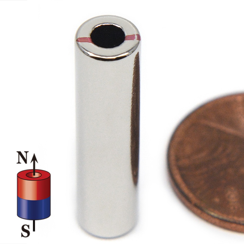 This slim ring neodymium magnet measures 1/4" in diameter and 1" in length and features a 1/8" hole through the length of the magnet. It is made of the grade N45 neodymium magnet alloy under ISO 9001 quality control systems, they are plated in a nickel-copper-nickel coating for a shiny corrosion resistant finish.