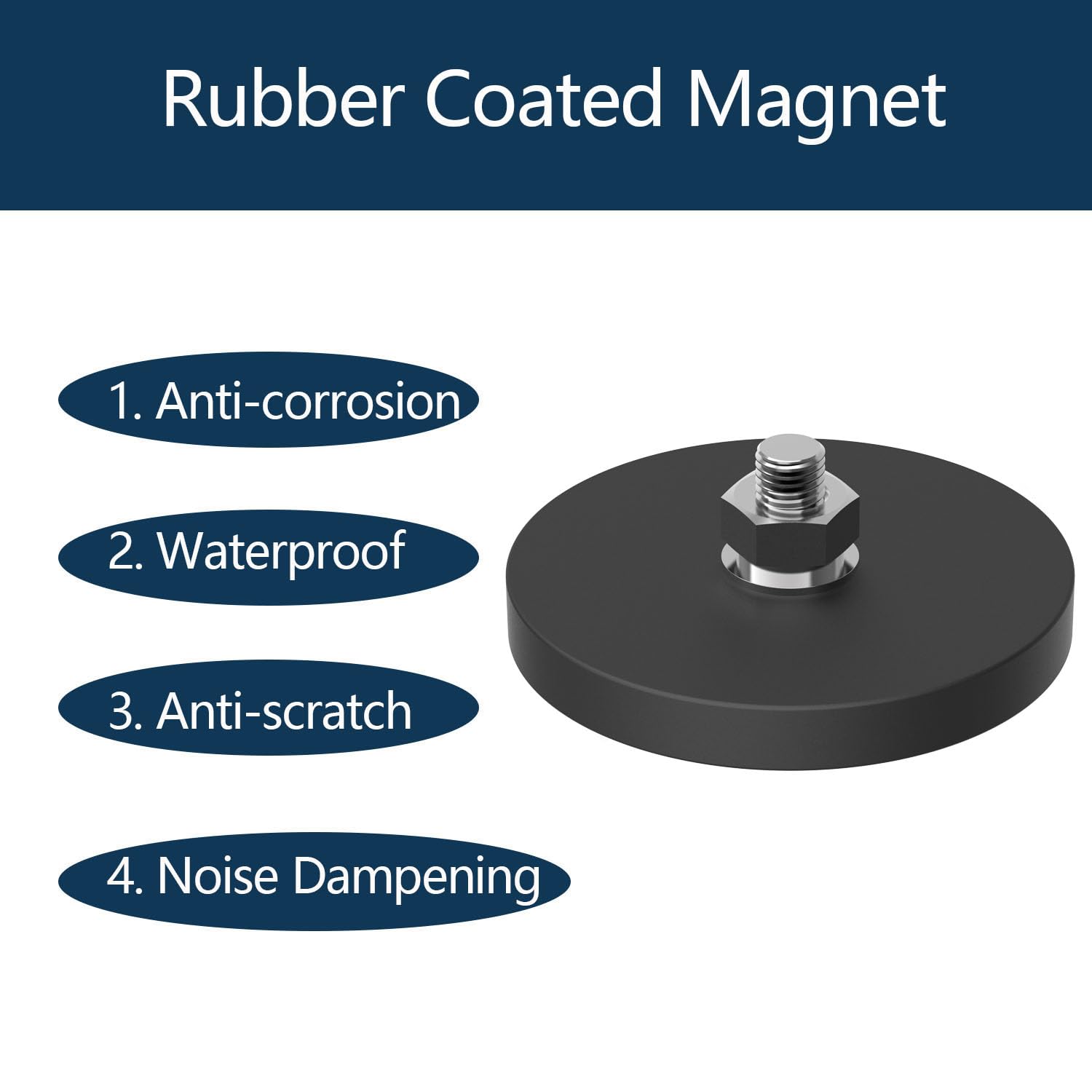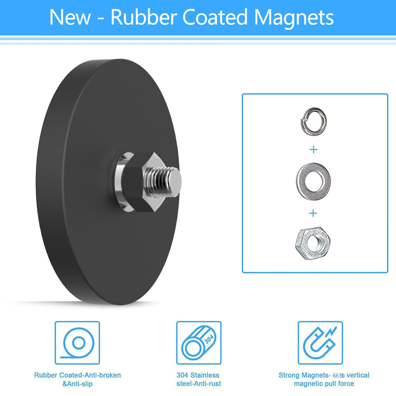 This 66mm diameter black rubber coated threaded pot magnet features a built-in circular steel plate and six evenly spaced disc-shaped neodymium magnets. This multi-magnet structure concentrates and enhances the magnetic force, providing a strong and stable attraction.