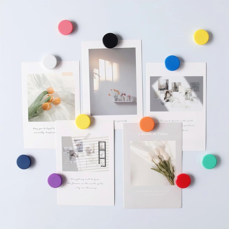 Small round magnets ensures scratch-free use on delicate surfaces, to keeps photos, memos, and artwork firmly in place—no slips, no falls.